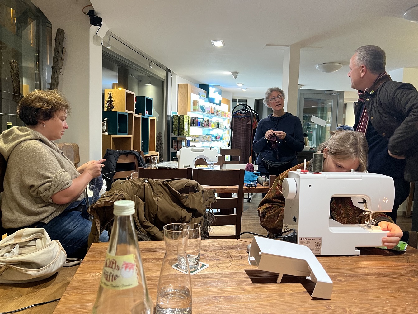 Ochsenfurt. An einem trüben Samstag Nachmittag trafen sich Alt und Jung in der Vinothek Öchsle bei einer Aktion der Grünen Ochsenfurt, um gemeinsam zu stricken, Lieblingsteile zu reparieren und aussortierte Kleidungsstücke zu tauschen. „Wir freuen uns über den kreativen Austausch, der dabei zustande kam, und über einige neue und gerettete Lieblingsteile“ meint Charles Leineweber, Ortsvorsitzender der Grünen, der diese Aktion eingefädelt hat und dabei von Monika Klein von Verstrickt & Zugenäht unterstützt wurde.