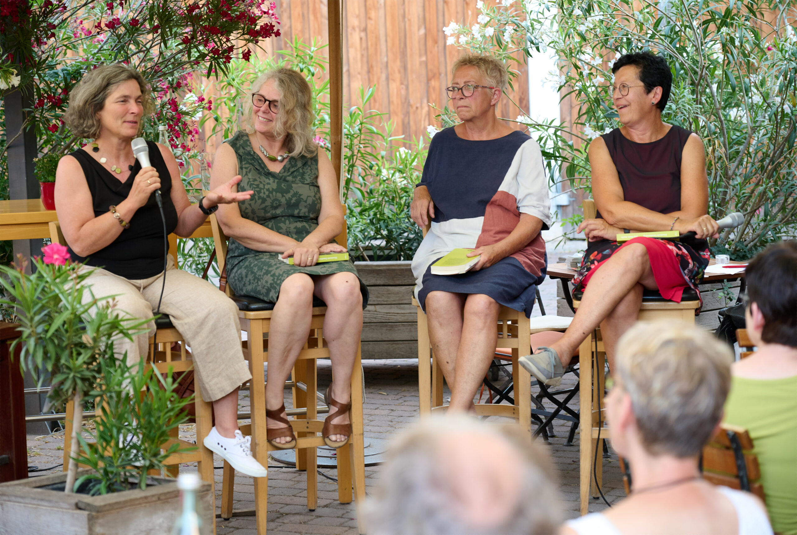 Im lauschigen Innenhof des Cafés von Michael Bieber in Kürnach entspann sich bald eine angeregte Diskussion mit den zahlreichen Zuhörinnen und Zuhörern, von denen sich viele mit eigenen Erfahrungen und Erlebnissen einbrachten. Die Forderung von Elisabeth Dauthendey, Frauen und Männer unabhängig von ihrer geschlechtlichen Einordnung eine freie Entscheidung über ihren Lebensweg zu ermöglichen, sie nicht in traditionelle Rollen zu pressen und sich nicht in traditionelle Rollen pressen zu lassen weckte grosses Interesse bei den etwa 30 Besucher*innen. Die mitgebrachten Exemplare des Buches, die die Veranstalterinnen verschenkten, waren jedenfalls schnell vergriffen.