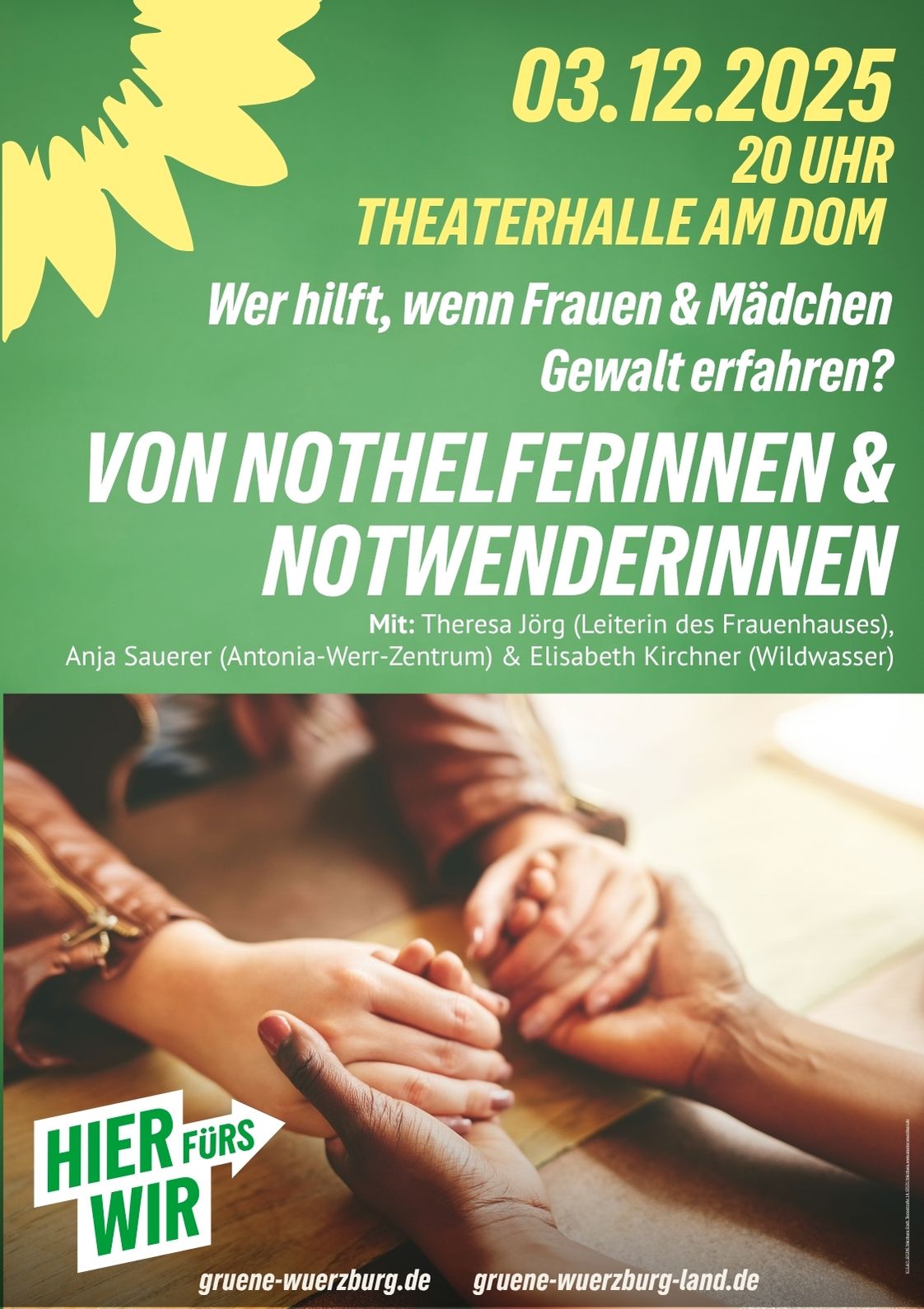 Zu Gast sind Theresa Jörg (Leiterin des Frauenhauses), Anja Sauerer (Antonia-Werr-Zentrum) und Elisabeth Kirchner (Wildwasser). Sie berichten aus ihrer täglichen Arbeit, ihren Erfahrungen, aber auch von jenen Frauen und Mädchen, deren Not gewendet werden konnte – und von Wegen, die aus Gewalt und Krise herausgeführt haben.