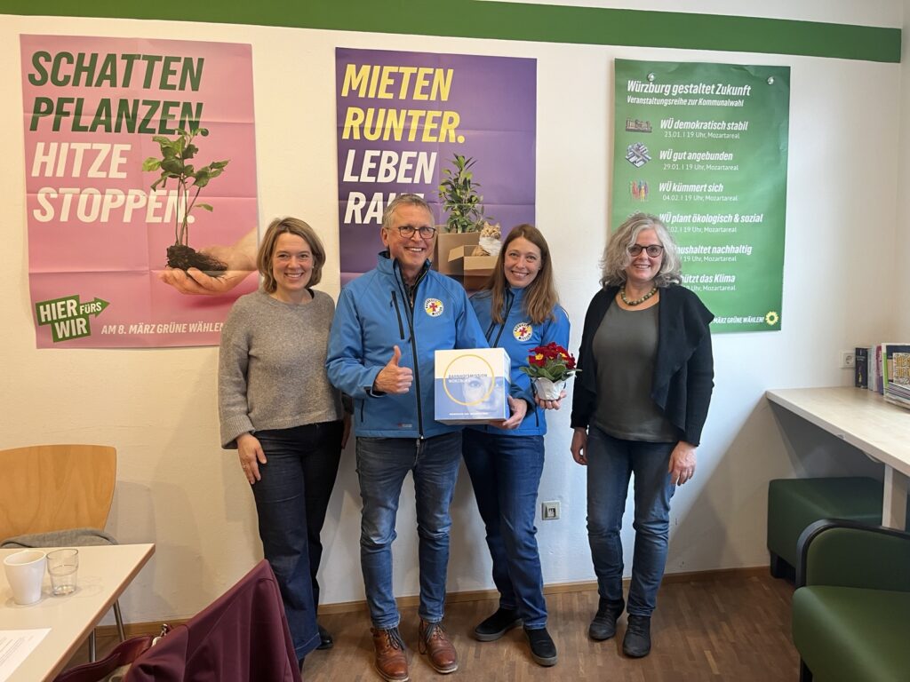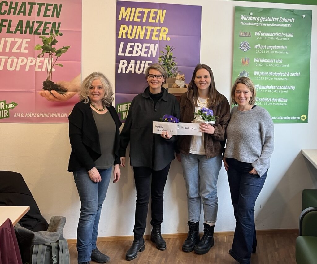 Am 20. Februar begrüßten die Vorsitzende vom Kreisverband Würzburg Land Jessica Hecht und die Bezirksrätin Christiana Feiler die Leiterin des Frauenhaus im SKF (Sozialdienst katholischer Frauen e. V. Würzburg) Theresa Jörg sowie Renate Schüßlbauer vom Verein Wildwasser e. V. im Grünen Büro. Im weiteren Verlauf des Nachmittags folgte der Austausch mit der pädagogischen Leitung der Bahnhofsmission Würzburg, Johanna Anken und Geschäftsführer Michael Lindner-Jung. Anlass war die Übergabe von Spenden, die in den vergangenen Wochen am Grünen Büro gesammelt worden waren.