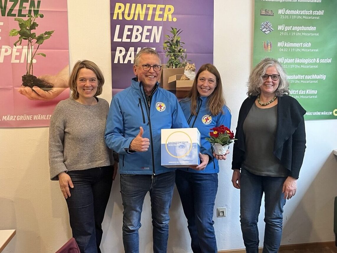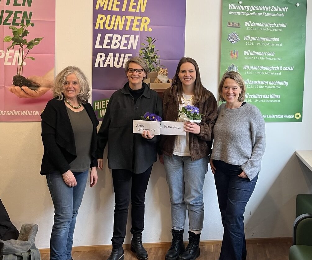 Am 20. Februar begrüßten die Vorsitzende vom Kreisverband Würzburg Land Jessica Hecht und die Bezirksrätin Christiana Feiler die Leiterin des Frauenhaus im SKF (Sozialdienst katholischer Frauen e. V. Würzburg) Theresa Jörg sowie Renate Schüßlbauer vom Verein Wildwasser e. V. im Grünen Büro. Im weiteren Verlauf des Nachmittags folgte der Austausch mit der pädagogischen Leitung der Bahnhofsmission Würzburg, Johanna Anken und Geschäftsführer Michael Lindner-Jung. Anlass war die Übergabe von Spenden, die in den vergangenen Wochen am Grünen Büro gesammelt worden waren.