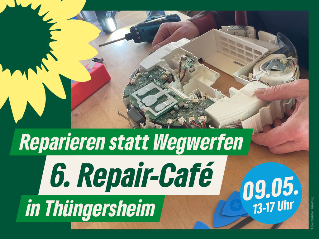 Reparieren statt Wegwerfen: Unter diesem Motto findet das 6. Reparatur-Treffen in der Alten Schule in Thüngersheim statt. Von 13 bis 17 Uhr unterstützen ehrenamtliche Reparateurinnen und Reparateure die Besucher dabei, Defekte an mitgebrachten Gebrauchsgegenständen zu untersuchen und gemeinsam zu reparieren. Die Veranstaltung organisiert der Ortsverband Bündnis 90/Die Grünen in Thüngersheim, der auch für eine entspannte, gemütliche Atmosphäre bei Kaffee und Kuchen sorgt.