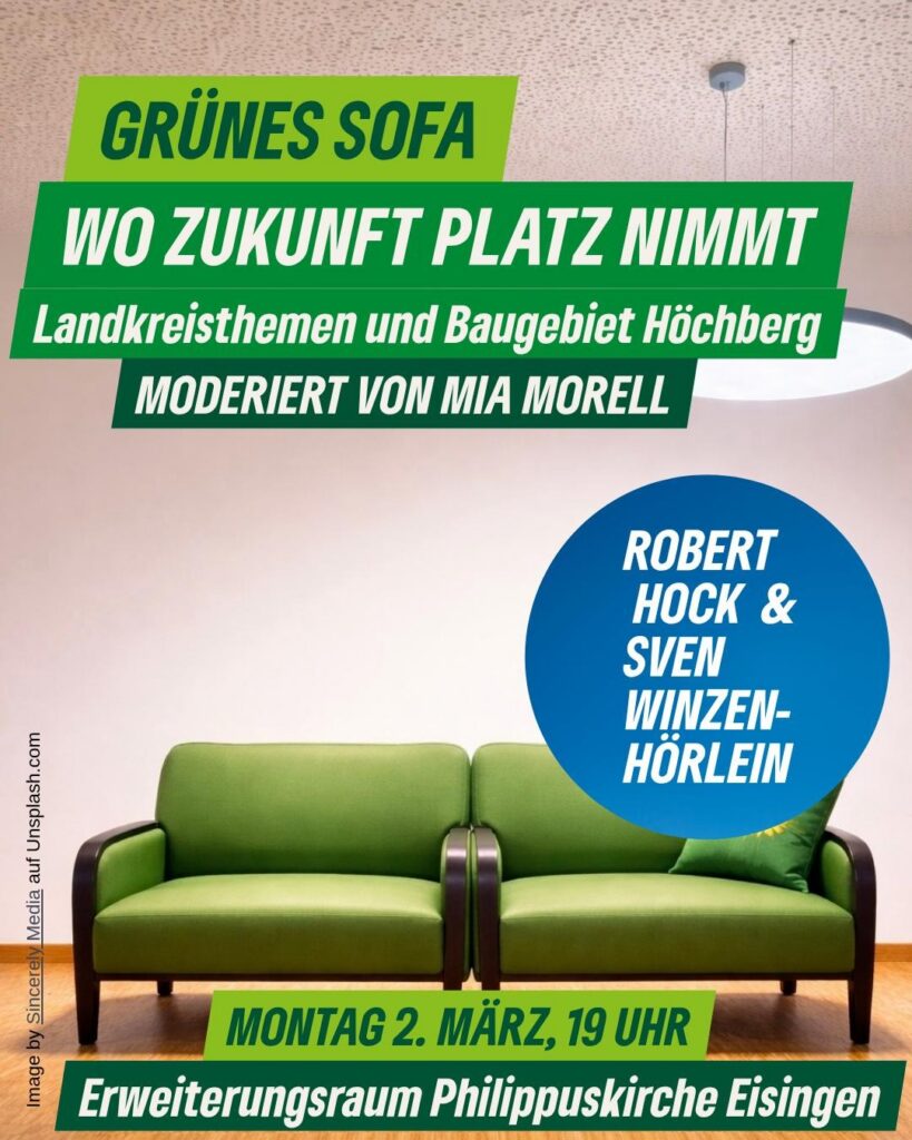 Grünes Sofa: Informationsgespräche zu Landkreisthemen und Baugebiet Höchberg mit Robert Hock und Sven Winzenhörlein. Moderation Mia Morell.
