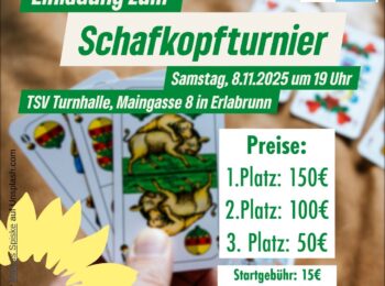 Bald ist es so weit, in Erlabrunn gibt es endlich wieder ein Schafkopfturnier! Der OV der Grünen veranstaltet zusammen mit dem Verein Bündnis Erlabrunn ein Schafkopfturnier in der Turnhalle des TSV Erlabrunn in der Maingasse 8, zu dem alle Schafkopf-Begeisterten herzlich eingeladen werden. Am Samstag, 08.11. beginnt das Turnier um 19.00 Uhr. Eine Anmeldung ist…