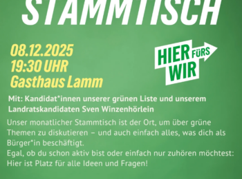 Am 08.12.2025 findet um 19:30 Uhr im Gasthaus Lamm der Stammtisch des OV Höchberg mit Kandidat:Innen unserer grünen Liste und unserem Landratskandidaten Sven Winzenhörlein statt. Unser monatlicher Stammtisch ist der Ort, um über grüne Themen zu diskutieren – und auch über alles, was dich als Bürger:In beschäftigt. Egal, ob du schon aktiv bist, oder einfach…