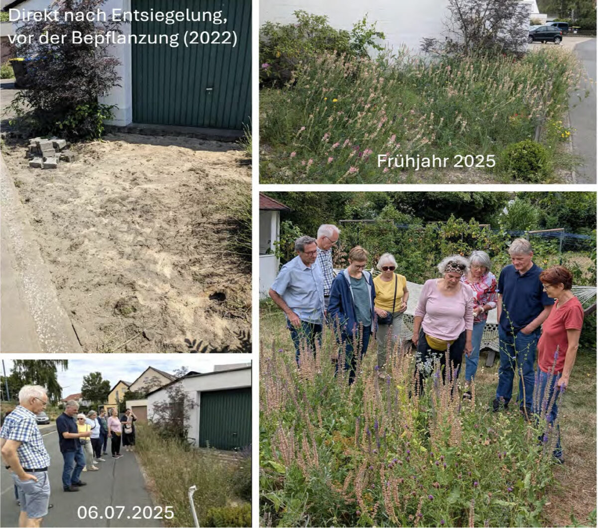 Beim geselligen Ausklang auf der Terrasse wurde schließlich lebhaft diskutiert, wie die Gemeinde Gerbrunn selbst mehr für Entsiegelung, Artenvielfalt und Klimaschutz tun könnte. In anderen Städten gibt es bereits Wettbewerbe wie das niederländische „Tegelwippen“ oder das deutsche „Abpflastern“, bei denen Bürger*innen und Kommunen gemeinsam versiegelte Flächen zurückbauen.