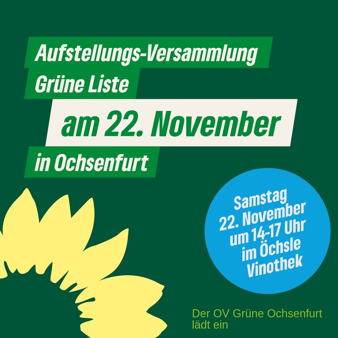 Es stehen 24 Listenplätze zur Verfügung. Stimmberechtigt für die Aufstellung sind alle Mitglieder der Grünen Ochsenfurt, die mindestens 18 Jahre alt und EU-Bürgerinnen sind sowie seit mind. 2 Monaten ihren Lebensmittelpunkt in Ochsenfurt haben .