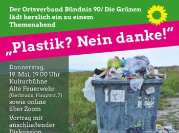 Der Ortsverband Gerbrunn Bündnis 90/ Die Grünen lädt herzlich ein zu einem Themenabend „Plastik? Nein danke!“Donnerstag, 19. Mai, 19.00 Uhr – ca. 20.30 Uhr Ort: Kulturbühne Alte Feuerwehr, Gerbrunn, Hauptstraße 7, sowie online über Zoo Vortrag mit anschließender DiskussionMaren Lohrer, Referentin für Verbraucherbildung Bayern Plastik ist praktisch und vielseitig – und mittlerweile überall. Nicht nur…